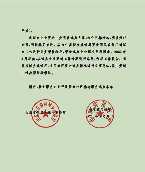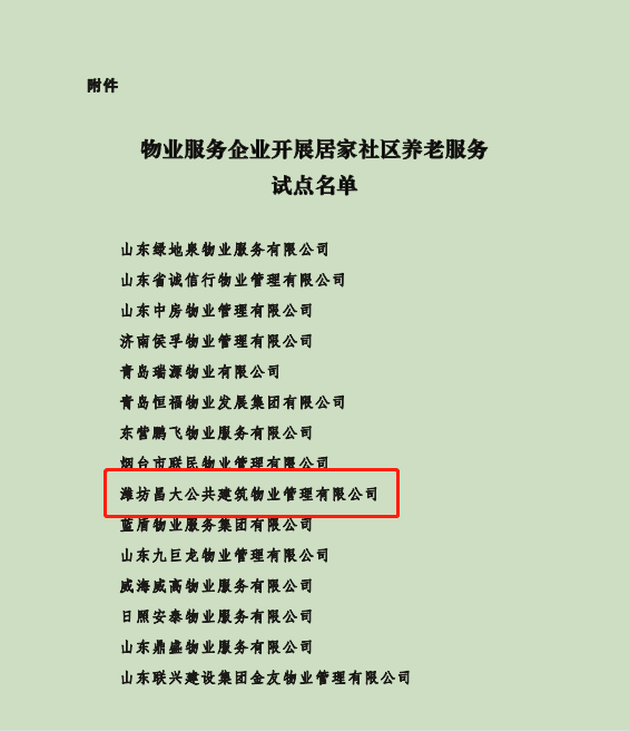 2021年9月6日,山東省住房和城鄉(xiāng)建設(shè)廳、山東省民政廳聯(lián)合公布了關(guān)于物業(yè)服務(wù)企業(yè)開展居家社區(qū)養(yǎng)老服務(wù)試點名單,我公司在首批試點名單之列。